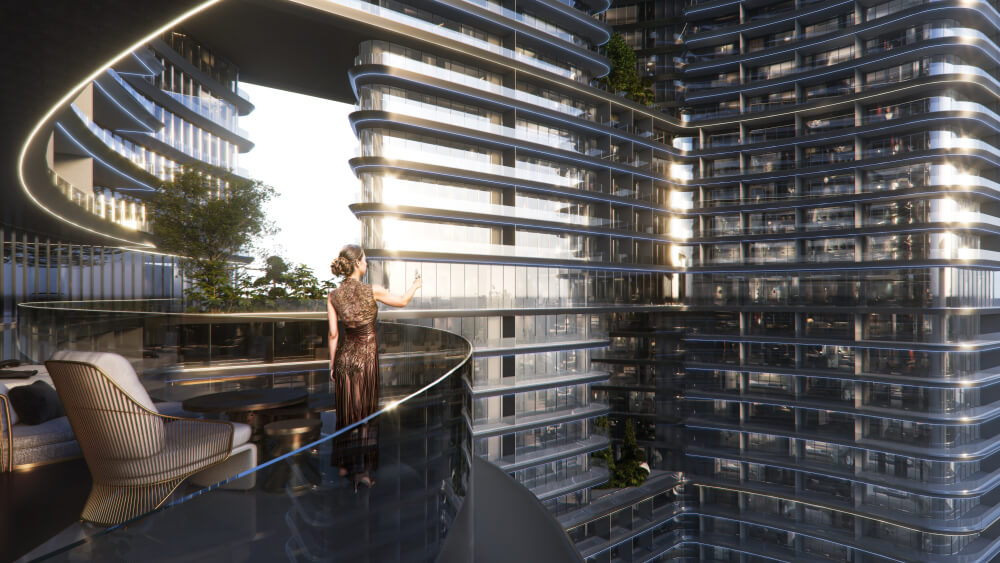 Drawing inspiration from the undulating slopes of the terrain, Binghatti Hills captures the essence of dynamic movement and organic grandeur. The rhythmic waves form a captivating illustration of two limbs intertwined, representing the seamless integration of modernity and tranquility. This emblematic gesture speaks to the brand’s commitment to bridging the gap between urban living and serene retreat.